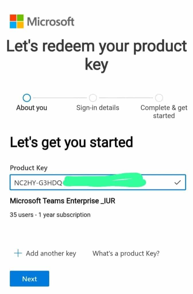 - Enter your Microsoft Teams Enterprise (1-Year) Product Key and click Next.